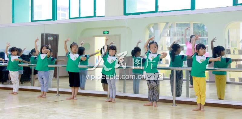 2019年6月21日,四川省華鎣市古橋街道幼兒園的孩子們?cè)诶蠋煹闹笇?dǎo)下學(xué)習(xí)舞蹈。