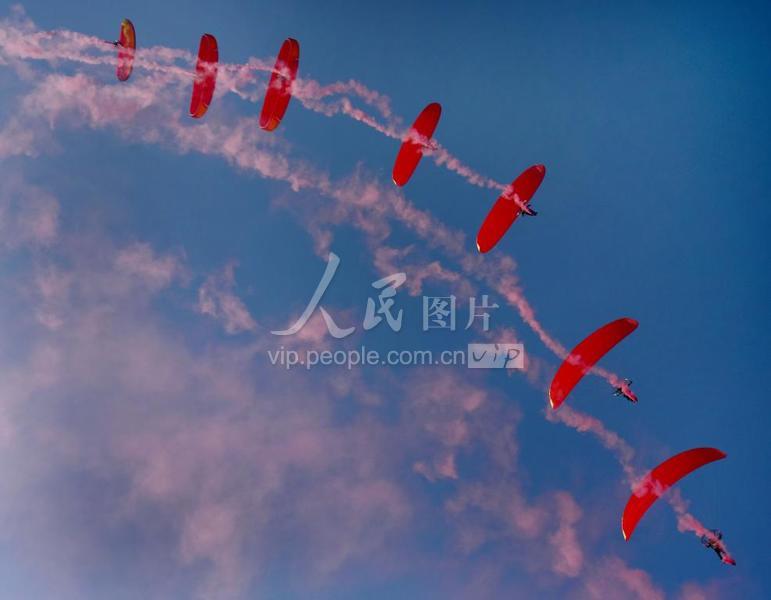 2019年10月20日,閉幕式現(xiàn)場參賽運動員在浙江武義大斗山飛行營地進行精彩的動力傘特技飛行表演。