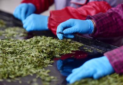 2020年2月23日,浙江武義湯記茶業公司員工邊忙著手工炒制新茶,邊現場直播售賣。 隨著近段時間天氣放晴和氣溫升高,中國有機茶之鄉浙江省金華市武義縣的一些早茶品種已吐出新芽,當地茶企不失時機采摘、手工炒制新茶。同時針對今年疫情影響,實行邊手工炒制新茶,邊在網上現場直播售賣,讓客戶更直觀了解茶葉嫩芽品質和手工炒制全過程。