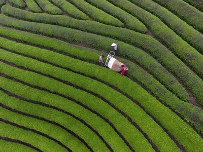 隨著清明節氣的臨近,浙江省金華市武義縣10多萬畝茶園新芽勃發、滿山翠綠,光憑手工采摘難以趕上節氣。為搶在清明前將頭茬春茶采摘下山,連日來武義縣1400多臺采茶機陸續上山入園趕采頭茬新茶,以提高種茶經濟效益。據悉,一臺采茶機日采摘鮮葉5千多公斤,相當于80至100名采茶工采的量。