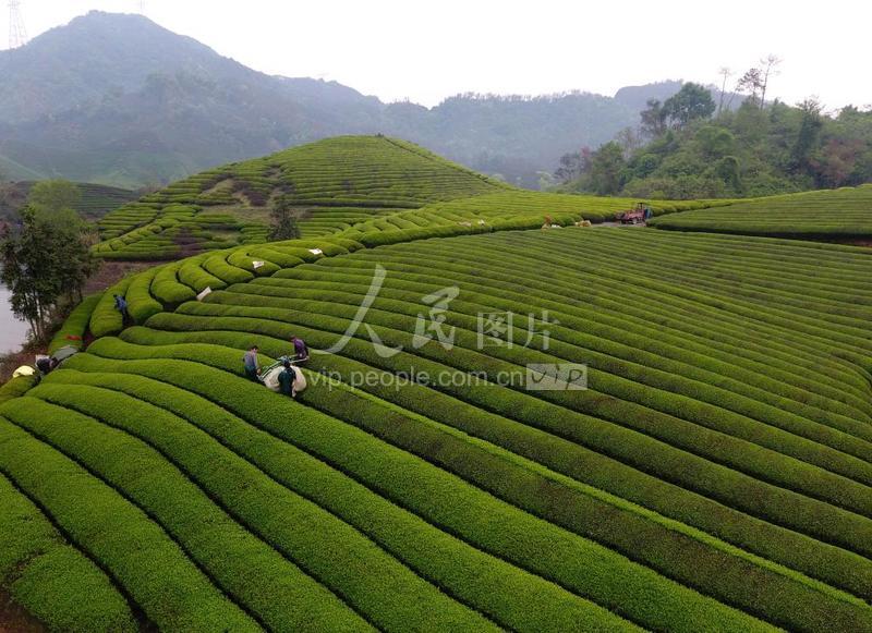 2020年4月2日,浙江省金華市武義縣王宅鎮陶宅村、壺山街道車里、上端頭等各地茶農用采茶機在茶園搶采明前茶。