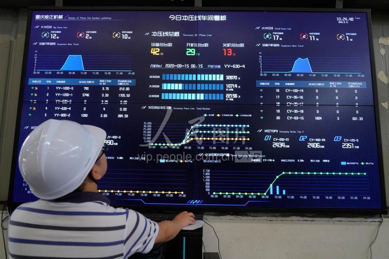 2020年9月15日,在重慶市北碚區正能機械有限公司,技術人員在調試工業互聯網“駕駛艙”看板。