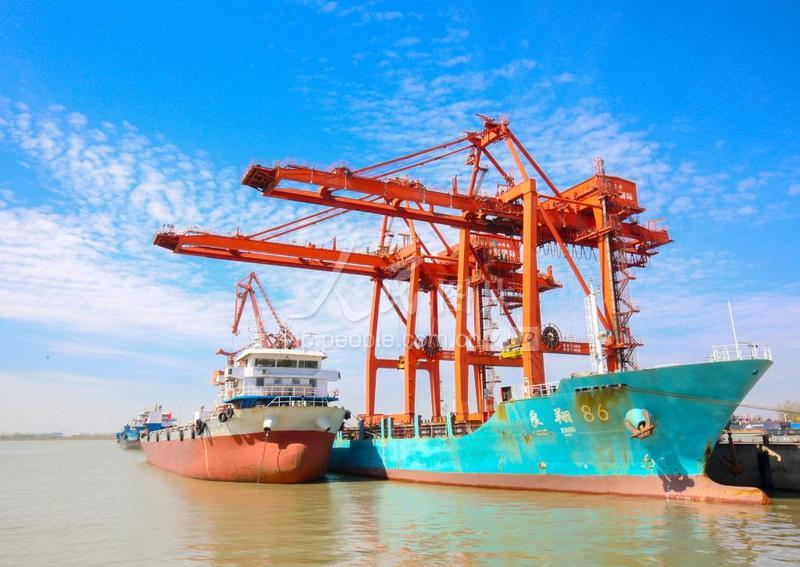 2021年4月5日,江蘇省如皋港,蘇中國際集裝箱碼頭港口機械正在吊裝物資。