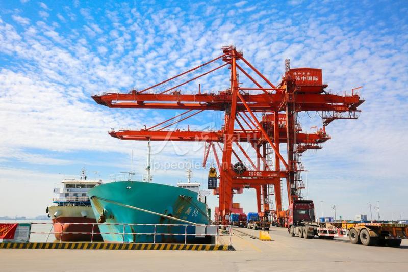 2021年4月5日,江蘇省如皋港,蘇中國際集裝箱碼頭港口機械正在吊裝物資。