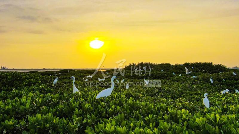 2021年5月24日,廣西北海市合浦縣廉州灣的一片紅樹林,落日下,一群群白鷺、灰鷺等鷺科鳥類在林繁葉茂的紅樹林里筑巢棲息。