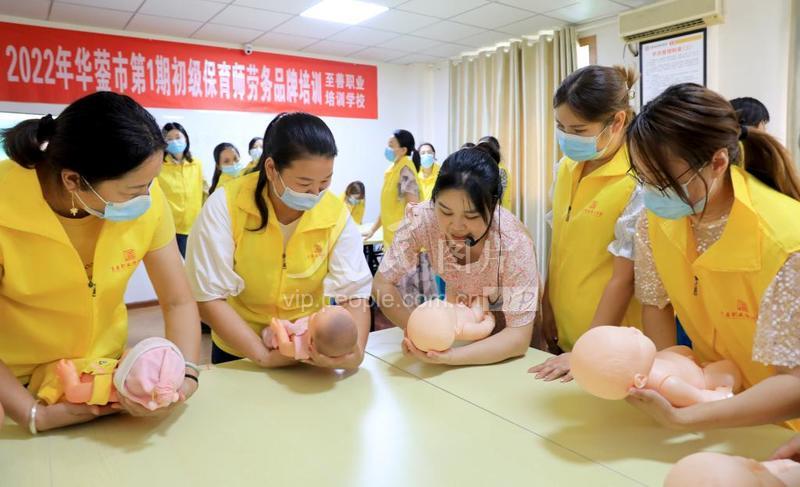 2022年9月14日,四川省華鎣市一名培訓學校的老師,在指導學員學習嬰幼兒護理知識。