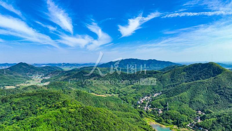 2023年6月28日,安徽省蕪湖市繁昌區平鋪鎮五華村附近,藍天白云映襯下的青山、碧水交相輝映,景色旖旎, 構成一幅絢麗壯美的自然生態畫卷。