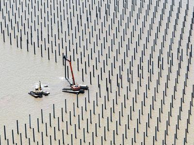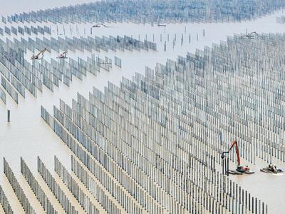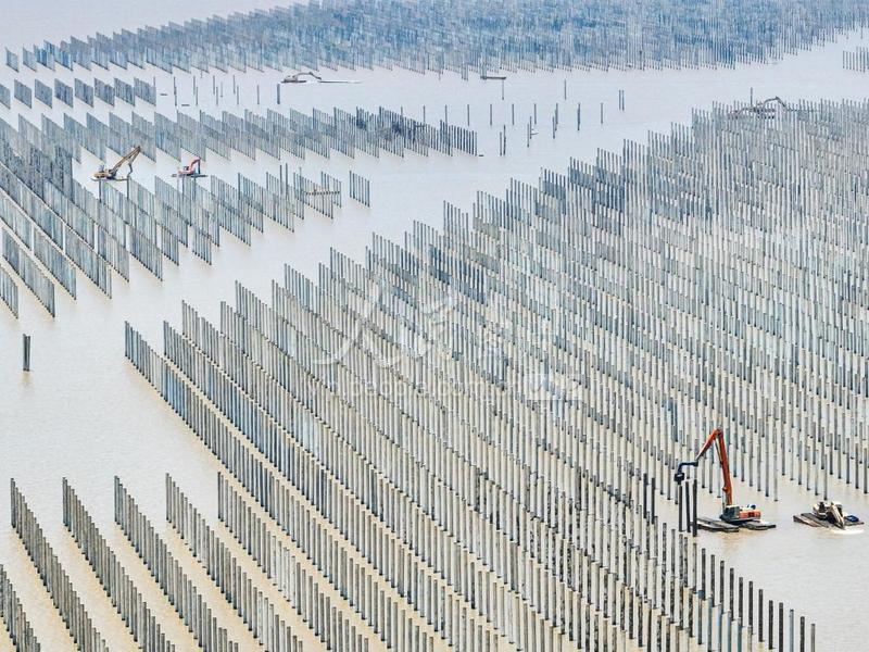2023年7月6日,浙江省溫嶺市東部松門灘涂光伏電站項目建設現場,施工人員各就其位進行管樁吊運、灘涂拖樁、定位打樁等工序,現場一派繁忙景象。
