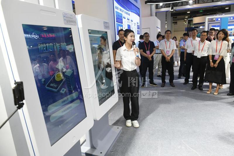2023年9月11日,在2023年安徽省網(wǎng)絡(luò)安全宣傳周網(wǎng)絡(luò)安全展覽現(xiàn)場(chǎng),講解員向參會(huì)人員介紹展區(qū)內(nèi)“防范微信詐騙”互動(dòng)觸摸屏。