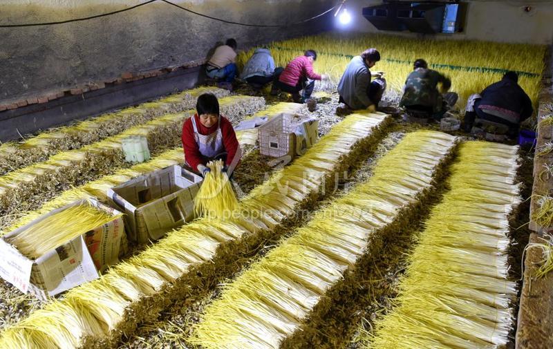 2023年11月7日,村民在山東省淄博市沂源縣悅莊鎮東埠村一“共富小院”收獲種植的蒜黃。