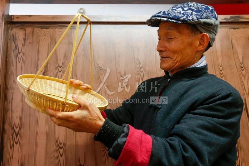 2023年11月10日,安徽黃山,非遺傳承人俞日華正在展示“徽州竹編”作品。