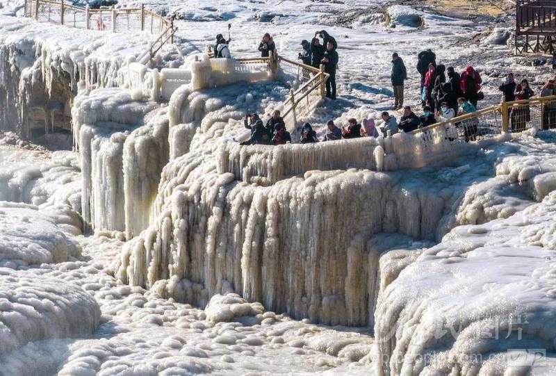 2024年1月6日,游客在山西省臨汾市吉縣黃河壺口瀑布景區觀賞冰掛冰瀑美景。