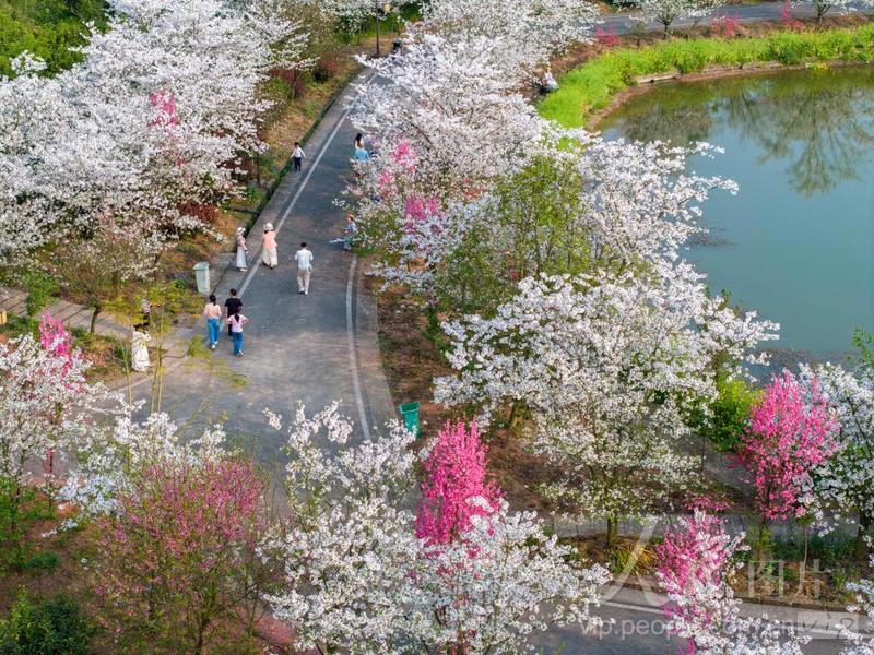 2024年3月23日,游人在重慶市北碚區澄江鎮五一村櫻花橘香農業公園欣賞盛開的櫻花。