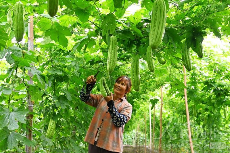 2024年4月24日,在廣西北海市合浦縣廉州鎮(zhèn)楊家山村蔬菜種植基地,農(nóng)民在采摘苦瓜,供應(yīng)市場(chǎng)。