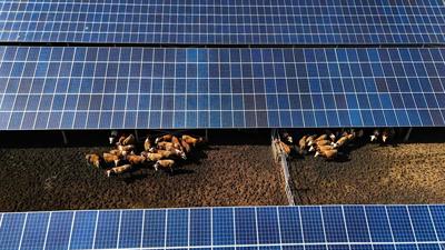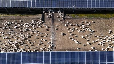 2024年8月14日,在山東省樂陵市鐵營鎮,一塊塊藍色的光伏板整齊排列在鹽堿地上,光伏板下養殖成群的牛、羊、鵝。 近年來,山東省樂陵市將綠色發展理念貫穿銜接鄉村振興集中推進區全過程,因地制宜在鹽堿地上建設“上發電、下種養”的農光互補、牧光互補等新能源產業,在節約土地資源的同時,為鄉村振興注入新動能。