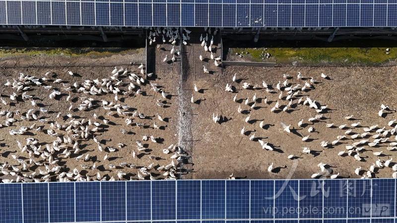 2024年8月14日,在山東省樂陵市鐵營鎮,一塊塊藍色的光伏板整齊排列在鹽堿地上,光伏板下養殖的鵝。