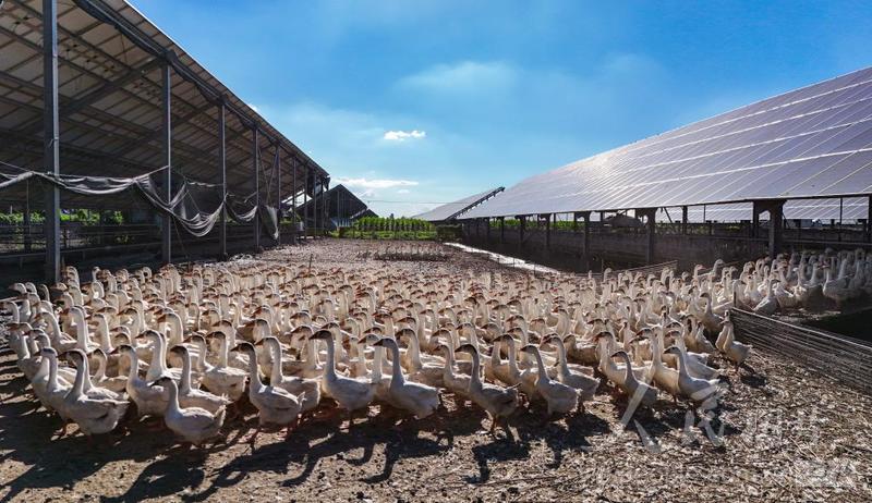 2024年8月14日,在山東省樂陵市鐵營鎮,一塊塊藍色的光伏板整齊排列在鹽堿地上,光伏板下養殖的鵝。